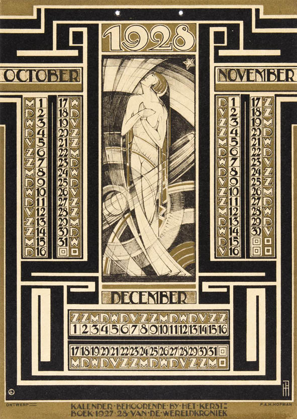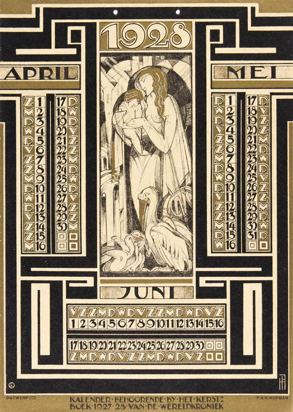 Pieter A.H. Hofman (1886-1965) was an artist from The Hague who designed mainly graphics, book covers and stained-glass windows. In 1927 Hofman made this stunning calender sheets for the Christmas book of the ‘Wereldkroniek’ (World Chronicle). Typically for his personal style is the mix of Symbolism, Art Deco and Amsterdam School. His right-angled monogram is placed at the bottom right of the pages.