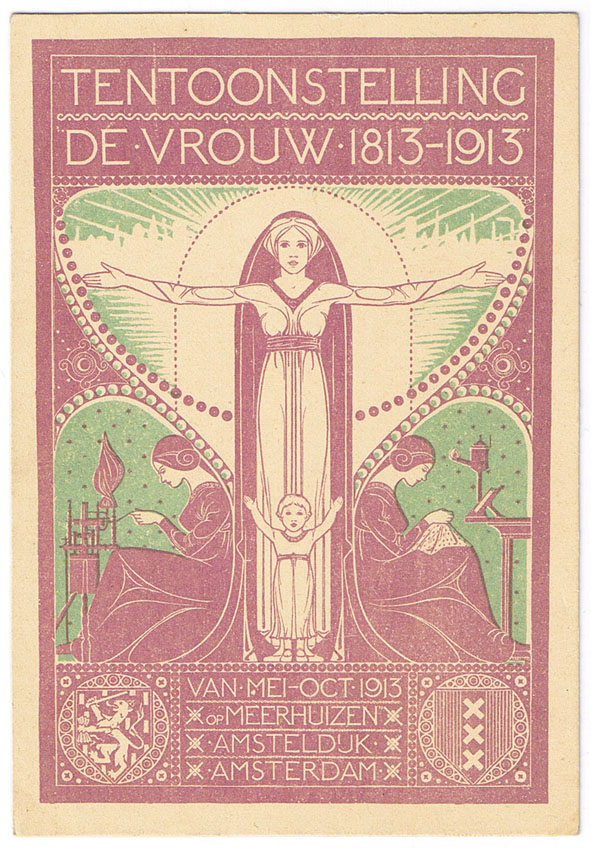The Amsterdam feminist movement had taken the initiative to organize a women’s exhibition. The aim of ‘De Vrouw 1813-1913’ was to show what the Dutch woman had achieved in the 100 years since the liberation. The exhibition drew comparisons between the life and social position of women in 1813 and 1913 in various fields, such as household, suffrage, art, literature, social work, sport and women’s labour. All the decorations and advertising work for the exhibits were made by female artists.