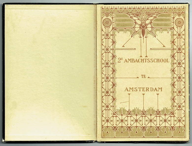 The book ornamentation for the diploma of the ‘2e Ambachtsschool in Amsterdam’ was made by bookbinder Johannes B. Smits. He was also working as a teacher at the Dagteeken- en Kunstambachtschool voor meisjes Amsterdam (Amsterdam women’s school for arts & crafts) and later at the school for applied arts in Zurich.