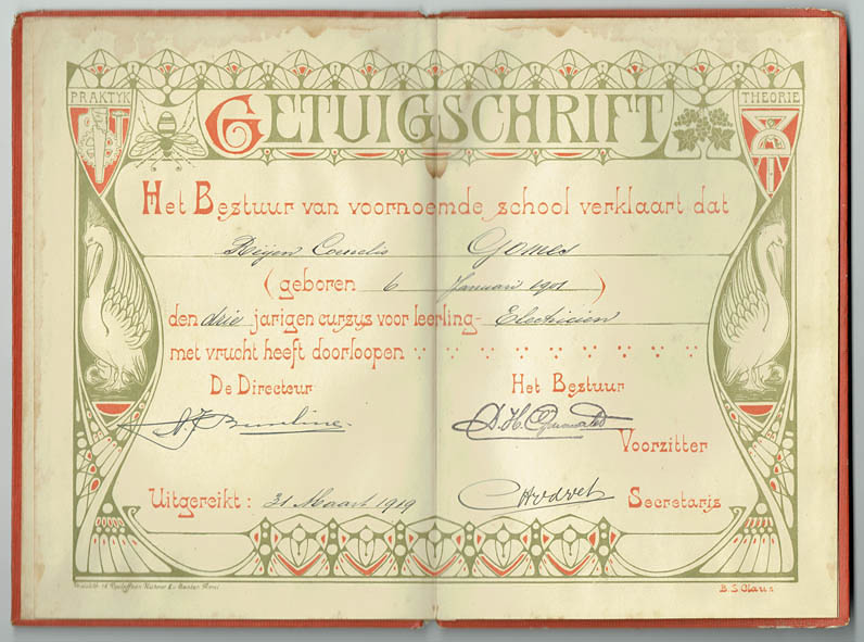 Benjamin S. Claus decorated the diploma of the ‘Ambachtsschool in (Den) Helder’. Claus gave drawing lessons at the crafts school in Arnhem. His style is influenced by the ‘foreign’ Art Nouveau; the lines are more flowing and the natural motifs are less stylized.