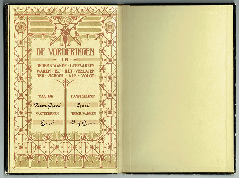 The book ornamentation for the diploma of the ‘2e Ambachtsschool in Amsterdam’ was made by bookbinder Johannes B. Smits. He was also working as a teacher at the Dagteeken- en Kunstambachtschool voor meisjes Amsterdam (Amsterdam women’s school for arts & crafts) and later at the school for applied arts in Zurich.