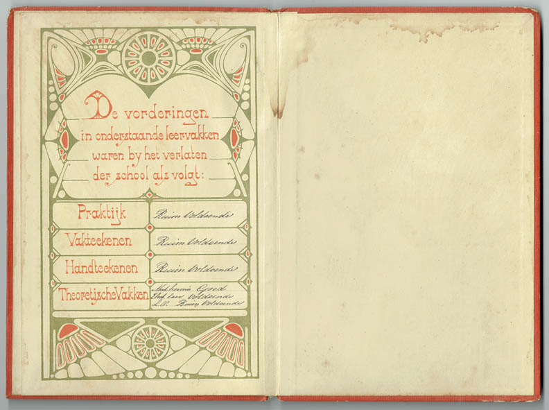 Depending on the level the training lasted 2, 3 or 4 years. After completing the education or course, the students received an ornamental diploma. Many of these beautiful decorated certificates are designed in the style of the Nieuwe Kunst (New Art), the Dutch variant of Art Nouveau. Characteristic of this style are the stylized natural motifs and geometric ornamentation.
