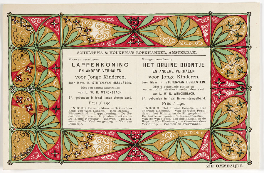 This book announcement for the 2nd edition of the novel ‘Een Liefde’ (A Love) from Lodewijk van Deyssel is by far the most beautiful prospectus I know. A simple piece of paper with a colorful Art Nouveau illustration by Theo Nieuwenhuis (1866-1951). Publishers House Scheltema en Holkema appreciated the design from Nieuwenhuis and used it for many other book announcements. However, sometimes the publisher made a mistake by turning the design on its side (see the 2nd picture). As a result, it seems as if the plant is growing from left to right rather than from bottom to top!